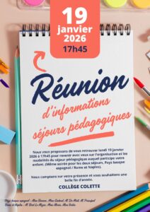 A l’attention des parents des élèves participants au voyage en Espagne La réunion d’information sur le voyage en Espagne aura lieu le mardi 23 janvier 2024 à 17h45 dans l’amphithéâtre du collège. Avec le plaisir anticipé de vous rencontrer, recevez mesdames et messieurs, mes sincères salutations. Miguel Principal Professeur d’espagnol